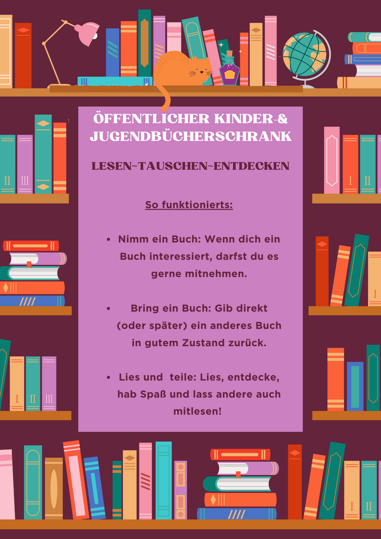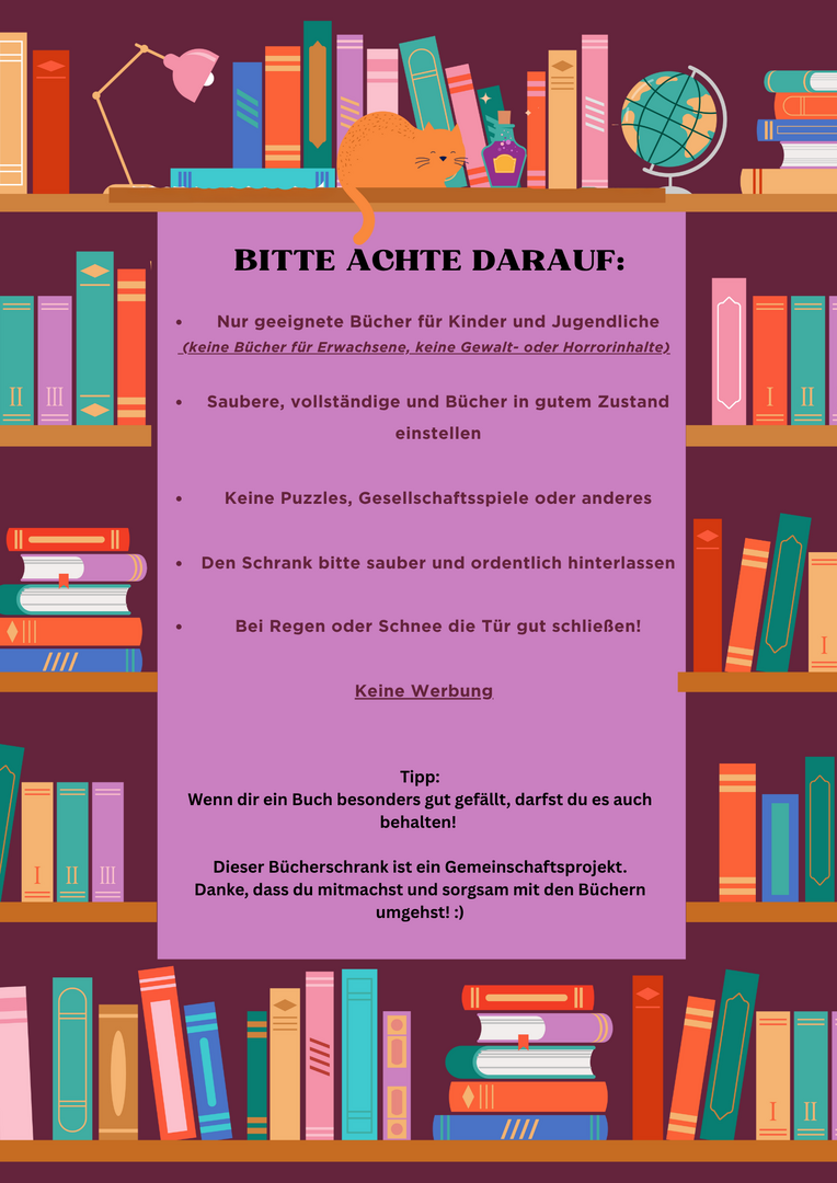 Seit November 2025 haben wir auf unserem Hof einen Bücherschrank. Dieser kann zum Ausleihen, Tauschen oder zum Verschenken von Büchern genutzt werden. Unser Bücherschrank richtet sich ausschließlich an Kinder und Jugendliche. Daher werden Bücher, die nicht altersgerecht sind, aus dem Schrank entfernt.